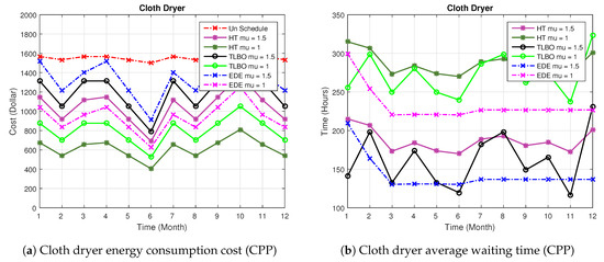- Cloth DryerWe consider cloth dryer for scheduling due to its higher flexibility. The performance of cloth dryer is presented in Figure 2a,b. Simulation results for cloth dryer are summarized in Table 2 and Table 3. In the case of HT, cost is 45% reduced as compared to the unscheduled cost with priority 1.5. By decreasing the appliance priority to 1.0, the cost is further reduced up to 60%. We compare EDE and TLBO with the unscheduled cost; results show that reduction in cost is 33% and 40% with priority 1.5 and show 53% and 60% reduction in the cost when priority is 1.0. However, EDE and TLBO avarage waiting time is 2.83 and 3.25 h, respectively when the priority is 1.0, which is less than the delay time of HT.