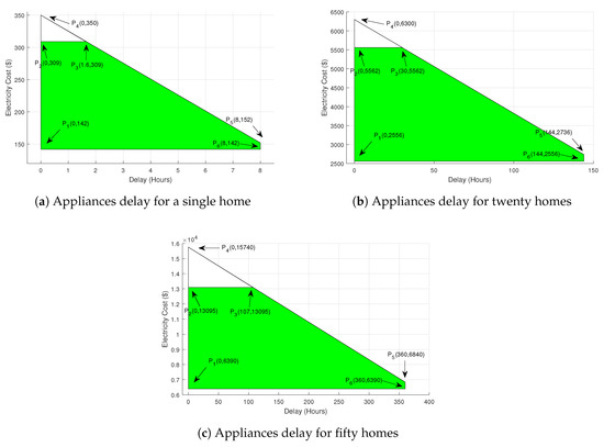 A tradeoff exists between the electricity cost and the delay of an appliance. Pictorial representation of feasible region for a year is shown in Figure 22c. By increasing the delay of an appliance the consumer will pay the minimum energy consumption cost. (0, 6390) represents the zero delay at minimum cost and (0, 15,740) shows the minimum delay at maximum cost. (360, 6840) and (360, 6390) shows the maximum delay at maximum cost and maximum delay at minimum cost respectively. (0, 13,095) and (107, 13,095) show the threshold for electricity consumption cost. This shows that suitable appliances can save a reasonable amount of energy by compressing the energy demand and schedule an appliance to off peak hour.