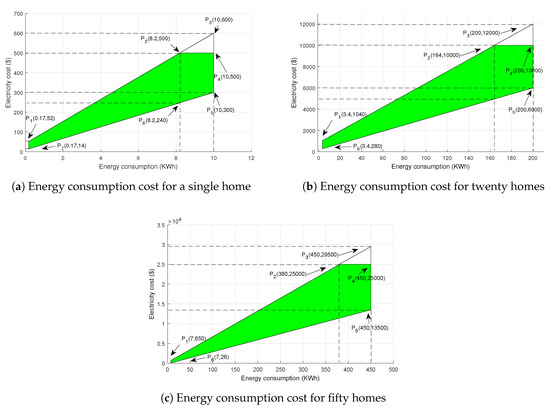 Scalability issue is managed by considering twenty and fifty homes and calculate the electricity cost of appliances in term of power consumption. In this scenario, our objective function also remains same but the number of homes is increased. Pictorial representation of feasible region is shown in Figure 23b. Feasible region is actually the area enclosed by points (3.4, 1040), (164, 10,000), (200, 12,000), (200, 6000), (164, 5000) and (3.4, 280). The maximum energy consumption cost at any point must not exceed 5465. This is actually the threshold which is calculated for energy consumption cost. (4440, 162) is the maximum energy consumption cost at minimum load and (3.4, 280) is minimum energy consumption cost at minimum load. (4440, 162) and (4440, 200) represent the same energy consumption cost but the use of energy is different for different cost. (200, 6000) and (164, 5000) depict the same use of energy at minimum cost 78 dollar and maximum cost 222 dollar. We can say that as the use of energy consumption increased the cost of energy is also increased so these are directly proportional.