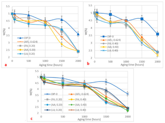 Water molecule absorption leads to polymer chain scission which in turn promotes paper insulation aging. So, polymer chain scission can be related to the reduction in moisture [23]. Figure 1b,c show that moisture in paper within virgin oil (HNAP) remained higher during aging. The amount of moisture decreased with aging time whatever the acid contents.