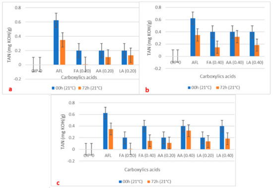 Acidity comparison before and after 72 h of exposure at room temperature: (a) 0.20 mg KOH/g and (b) 0.40 mg KOH/g for three different acids (formic, acetic and levulinic), acid mixture and also for acid-free oil. The results are summarized in Figure (c) for better comparison.
