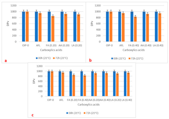 Degree of polymerization before and after 72 h exposure at room temperature: (a) 0.20 mg KOH/g and (b) 0.40 mg KOH/g for three different acids (formic, acetic and levulinic), acid mixture and also for acid-free oil. The results are summarized in Figure (c) for better comparison.