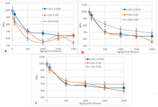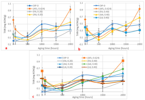 Figure 4a–c show the evolution of the TAN during aging. In general, there was a decrease in the TAN for all acid concentrations up to 500 h aging. The absorption of carboxylic acids initially added in oil explains this drop in acidity [16]. This absorption may be related to the reduction in paper’s polymerization degree (DPv) at this aging duration, which will be seen later. From 500 h up to 2000 h of aging, the TAN increases with aging time. This may be traced to the production of high molecular weight carboxylic acids that could not be absorbed by paper [17]. However, the results in Figure 4a indicate a low value of the TAN for 0.20 mg KOH/g of formic acid throughout the aging process. For oil containing 0.40 mg KOH/g of formic acid (Figure 4b), a low value of the TAN was observed after 72 h exposure at room temperature. However, during thermal aging, the TAN of oil with acetic acid was lower after 500 h (Figure 4b). The TAN of oil with formic and levulinic acids remained lower for 1500 and 2000 h aging, while the TAN of oil with mixed acid suddenly increased up close to 2000 h of aging. The increase in the TAN of oil with mixed acids during aging can certainly be traced to the generation of high molecular weight acids resulting from oil and paper degradation [6,8,16,18]. These findings are confirmed by partitioning studies reported by Lungaard et al. [8,18]. Indeed, at increasing temperature, more acids are moved to the oil due to an increased solubility with an activation energy much higher for formic acids.