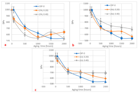 Figure 5a shows a comparison of the degree of polymerisation (DPv) of paper impregnated with oil containing formic acid as well as oil-free acids as function of aging duration. Generally speaking, the DPv of all samples aged in oils with both acid concentrations of 0.20 and 0.40 mg KOH/g decreased with aging, as expected. Some of the trend variations in the DPv values could be due to recombination of polymer bonds [31].