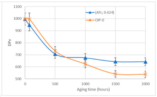 After this period, acidity increased gradually with aging in the two samples, but was more significant in the virgin oil than in the acid oil. However, in AFL, the moisture content of the paper (Figure 1) decreased brusquely to a value of 3.5% and then to 2.5%, at the same time the acidity increased sharply after 1500 h. This supports the idea that moisture and low molecular acids have a multiplicative effect [12,16,18]. This trade-off between acidity and humidity can lead to a compromise, which explains the “pseudo-variation” of the DPv (which decreased very slightly after 500 h of aging). In comparison, in OIP, humidity remained high throughout the aging period, at >3.5%, while the acidity increased gradually, which explains the decrease in DPv over time. Therefore, oil blended with acid mixture has a less harmful impact on the paper compared to virgin oil.