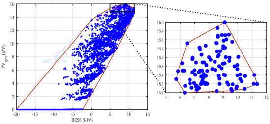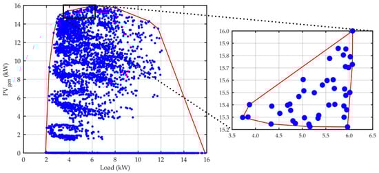 In this paper, PV hosting capacity is defined as the ratio of total PV generation of the LV network to the respective feeding transformer capacity. In [], maximum network load was used for scaling HC rather than transformer capacity. In that case, HC varies with the varying peak load of the network. As the network nodes differ based on MV change value (±5%, 0%), HC values calculated this way will be dependent on the network nodes, in turn on its peak load. However, if transformer capacity is taken as a reference all the HCs for a particular region are easily comparable. For HC determination, MC simulations are based on worst-case hours, instead of all the 8760 hourly data sets. The data sets having large PV generation and minimum loading, located in the top left corner of the convex hull, are considered, as shown in Figure 2.