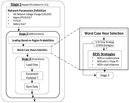 Figure 4 depicts, different stages involved in the MC-based HC determination algorithm. Stage 1 defines the network parameters based on the type of network chosen. Once the specific network is determined, stage 2 commences with the definition of loading scenario and worst case data sets. Loading scenarios are based on the probabilities of different types of customers based on the region. As the region changes, the load probability of households varies and the loading profile of the whole network changes. Thus, worst-case hours differ from one region to another, as they are dependent on the loading scenarios. There are 1000 iterations of stage 2 and in each iteration, different loading scenarios are considered dependent on the regions’ loading probability that in turn modifies the worst-case hour datasets. Once the small set of worst-case hours is selected, stage 3 iterates 10 times while randomly selecting values from the worst-case hours. Lastly, load flow is computed for the predefined network, and the constraints violations are determined. PV size is incremented in every stage 1 iteration, until the violations exceed 2.5% of the total number of iterations.