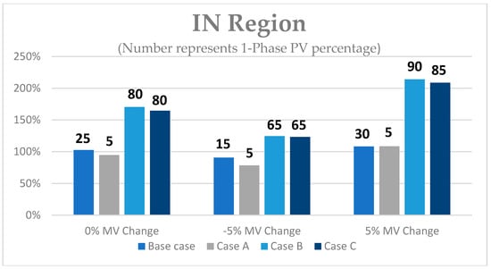 HCs for all the MV change values for different cases and regions (PR, IN) are presented by the bar graphs of Figure 5 and Figure 6. In PR region, when case A is implemented, E4 (voltage unbalance) is limiting the HC even at 5% of the single-phase PV connections for all the MV change scenarios. BESS random connection among the phases increases the voltage unbalance and the HCs’ are close to 20% for all the simulated scenarios. Nevertheless, in case B, as the battery is attached to the same phase as the PV, the HCs are drastically increased. The single-phase PV percentage rises to 60%, 20% and 100% for 0%, −5% and +5% MV change cases, respectively. The largest increment in HC is seen in the +5% case, in which the HC is quadrupled. In case C, the load unbalance is also incorporated, which in theory should reduce the HCs for the E4-dependent scenarios. The single-phase PV connections reduction in 0% MV change case is 15% and 5% for the MV change scenarios. With the increased voltage unbalance, E4 is violated earlier than in case B, lesser unbalanced PVs will lead to the increased HCs. Nevertheless, in +5% MV change scenario, HC is decreased irrespective of the reduced percentage of unbalanced PVs. This signifies that the unbalance increment, due to the load unbalance addition, is larger than the unbalance reduction due to 5% increment in the balanced PVs.