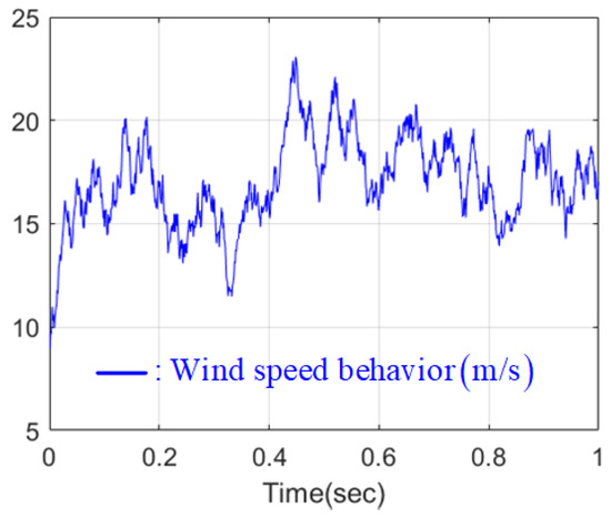 The wind power system was emulated by the powerSIM (PSIM) software using its wind turbine and permanent magnet synchronous machine (PMSM) model. The following values were selected for the nominal output power, inertia, base wind and rotational speed, and initial rotational speed of the wind turbine: 10-kW, , , 50 rpm, and 10 rpm, respectively. The PMSM parameters were chosen as (stator resistance), (d-q inductances), (flux), (number of poles), (inertia), (viscous damping). The Weibull distribution-based wind model [23] was used to randomly determine the wind speed for the wind turbine, which is shown in Figure 2. As components of the DC/DC boost converter, the inductance of L and the capacitance of C were selected as