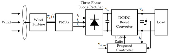 where the averaged inductor current of and output voltage of are treated as the state variables, and the duty ratio of acts as the control input constrained in the closed-interval of . The inductance and capacitance values are denoted as L and C, respectively. The input DC source voltage of comes from a wind power system comprised of a wind turbine, PMSG, and rectifier, and the load current of acts as the external disturbance.