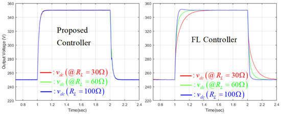 The last simulation examines the output voltage tracking performance change behaviors as increasing the cut-off frequency of to Hz. In this simulation, the output voltage reference was increased from to under a resistive load of . The comparison results are presented in Figure 9, which indicates that the closed-loop output voltage tracking performance was precisely adjusted by the proposed technique using a fixed control parameter set in the presence of model–plant mismatches.