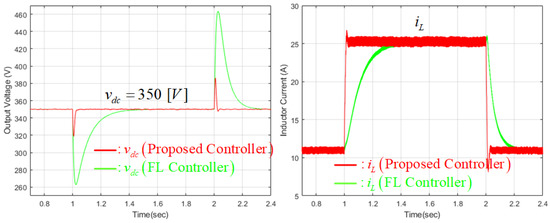as long as the nominal parameters of and exactly match their true values of L and C for all operating points, where , , , and represent the Laplace transforms of , , , and , respectively. It is easy to see that the control objective of the FL technique is the same as that of the proposed technique. The FL controller of Equations (22) and (23) was implemented using the nominal parameters of and with the cut-off frequencies of rad/s and rad/s, i.e., Hz and Hz.