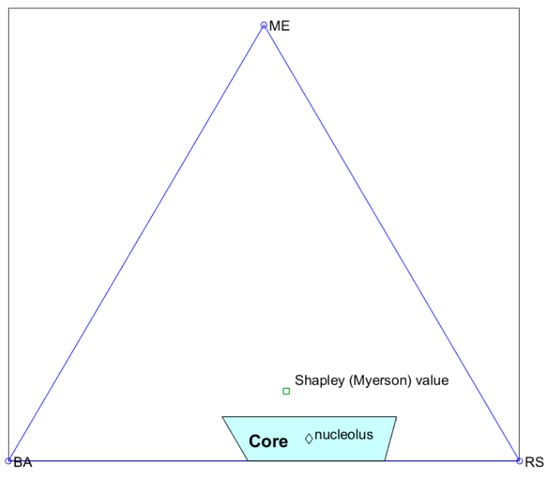 The next step is to allocate this savings to the three countries participating in this game. For this 3-country game, due to network topology, all seven possible coalitions include only connected components, thus in this case Myerson value is identical with Shapley value, as can be seen from Equations (5) and (9). The nucleolus and Shapley value solutions for the 3-country game are presented in Table 3 while the core of the game and the placement of nucleolus and Shapley value are drawn in Figure 3. The area of the triangle encompasses all rational solutions (imputations) and each point of this triangle has barycentric coordinates which equal the savings allocated to each country according to the solution represented by this point. The sum of the barycentric coordinates of each point is fixed and equal to the savings of the grand coalition, i.e., 659. For example, for the countries {BA, RS, ME} the barycentric coordinates of the triangle’s vertices are [659, 0, 0], [0, 659, 0] and [0, 0, 659], respectively. The core is the area of the imputations that hold the global and coalitional rationality (see Equations (6) and (7)). As can be seen in Figure 3, the Shapley value is off the core for this game while nucleolus is, by definition, within the core.