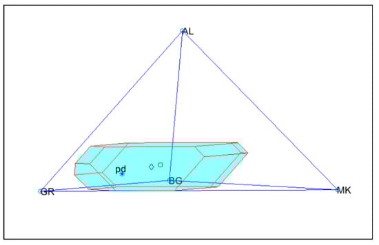 Table 5 illustrates the savings allocated to each country according to the three different solution schemes used for this game. Finally, Figure 4, which has been drawn by incorporating some additional elements from the toolbox in [], provides an illustration of the 4-country game where the regular tetrahedron encompasses all rational solutions (imputations) of the game while the light-blue painted area denotes the core of the game. As can be seen, all three solutions are located within the core of the game.