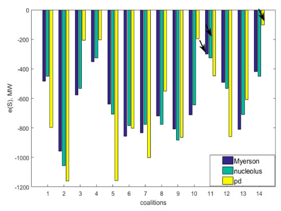 By measuring the excess of the unhappiest coalition we can determine which one of the three methods provides the relatively less robust solution. We remind that, according to Equation (8), a smaller excess indicates a happier coalition because the excess measures the difference between what the coalition can safeguard by itself and what a specific solution vector assigns to this coalition. As can be seen in Figure 5 (see the arrows in the upper right area), the proportional division rule provides the relatively less robust solution. Indeed, the excess of the unhappiest coalition, according to Equation (8), under Myerson value, nucleolus and proportional division is −300.1 MW, −326.0 MW and −103.0 MW respectively.