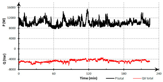 Figure 2 shows the variability of active and reactive total power in the monitored period. Figure 3 shows changes in active and reactive power on individual phases L1, L2, L3 during the measurements.
