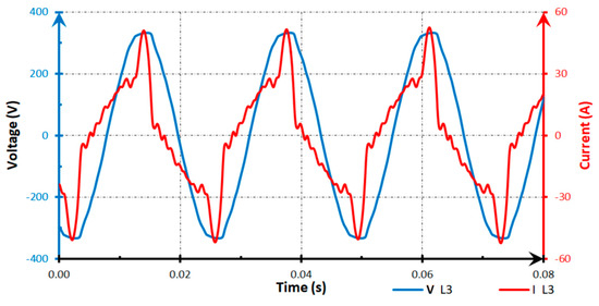 The course of voltage and current in the L3 phase in the monitored facility.