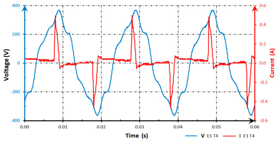 Figure 5 presents a typical course of voltages and currents during the study of the E1 lighting source while testing with levels for Test T4, which can be considered typical for all tested sources.