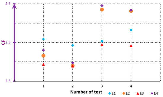 Simultaneously, in Figure 6 and Figure 7, results of changes in power factor (PF) and crest factor (CF) in the function of tests are presented.