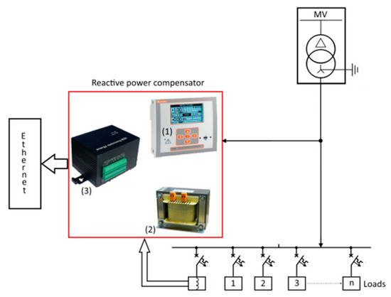 Preliminary measurements (selected results presented above) showed the need to install systems for the capacitive reactive power compensation. It was assumed, according to the recommendations of the energy supplier, that the ratio of inductive reactive energy to active energy (tg φ) can be a maximum of 0.4 in the settlement period. Therefore, the system regulates in hysteresis way by switching on current-compensated chokes in the range of 0.2 < tg φ < 0.4. Based on the recorded data, a reactive power compensation system was selected for the facility. The schematic diagram of the chosen power compensation system is shown in Figure 8. The choice was made in accordance with the general recommendations that are presented in [19,20]. The implemented reactive power compensation system consists of the DRLCG (1) regulator from Lovato Electric [21], the Elmond [2] ED1K reactor assembly [22], the ECV management and communication module (3) from Energy Management Systems [23]. The system of current-compensated chokes compensating capacitive reactive power was chosen on the basis of the average power measured during preliminary tests.