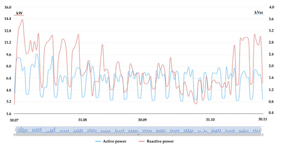The above-realized functions are available online for the supervising system, which allows for the monitoring of the system on an ongoing basis and quick responses to occurring events. Figure 9 shows the recorded active and reactive power consumption in the period ranging from the system introduction to the end of November 2017. The results were obtained from the monitoring application, which is updated and enriched with new tools facilitating the analysis and operation of the system at the program layer.