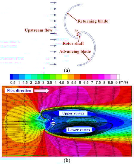 A conventional two-bladed Savonius rotor is schematically shown in Figure 1a. As for the returning blade, its rotation is hindered by the upstream flow, and a part of the kinetic energy carried by the upstream flow is not transferred into useful work. Consequently, the energy utilization ratio is undermined. Such a rationale is illustrated by the flow pattern near the Savonius rotor, which was obtained in the present study and is displayed in Figure 1b. It is seen that the returning blade is exposed to the resistance of the uniform upstream flow. At this moment, the upstream flow near the rotor is obviously influenced by the convex and concave blade surfaces. The initially straight and parallel streamlines featuring the upstream flow are distorted due to the invasion of the rotor surface. The numerical result obtained here is similar to that documented in []. Additionally, with such a rotor orientation with respect to the upstream flow, a large torque coefficient is predictable; the contribution of the advancing blade is predominant for the torque production.