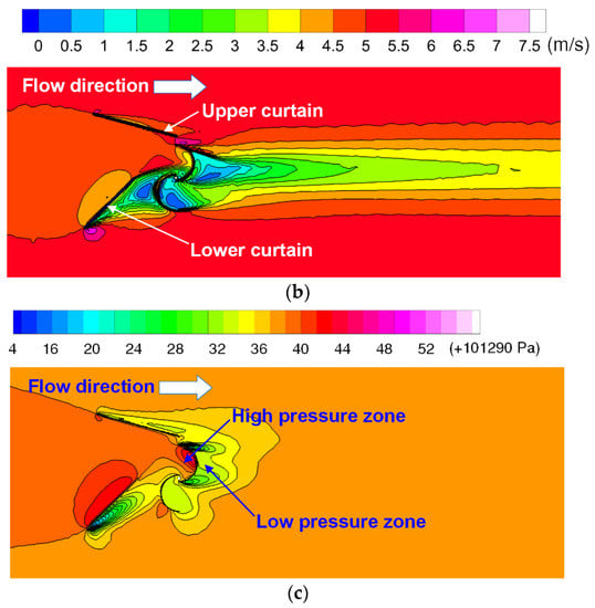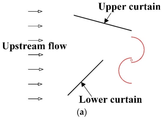 Cross-sectional flow parameter distributions with upstream curtains. (a) Configuration of upper and lower curtains []; (b) Velocity distribution; (c) Static pressure distribution.