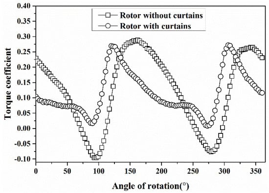 The most distinct advantage of numerical simulation is that static pressure can be acquired, which cannot be obtained using existing experimental techniques. In the present study, based on the numerical results associated with the two cases shown in Figure 1 and Figure 2, the static pressure over the rotor blade surface was integrated to calculate the torque exerted on the whole rotor. In Figure 3, the torque coefficient is plotted as a function of the angle of rotation based on the numerical results. It is explicit that negative torque coefficients are completely eliminated with the deployment of the two curtains, although the maximum torque coefficients of the two cases are nearly equal. This means that energy conversion for the scheme with the curtains is more effective compared to its counterpart. Alternatively, no energy is consumed to hinder the rotation of the rotor.