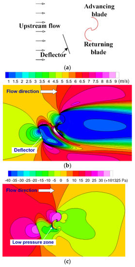 With respect to the situation demonstrated in Figure 2, the lower curtain is apparently more important than the upper curtain since it directly blocks the upstream flow that will otherwise impact on the returning blade. Actually, the attempt of using this curtain exclusively was made in [], as illustrated in Figure 4a. In this context, curtain, plate and deflector are three names with the same meaning. The flow parameter distributions with such a configuration were simulated in the present study, and the results are displayed in Figure 4b,c. It is seen that the flow field gives an impetus to the clockwise rotation of the rotor. Another flow feature in Figure 4b is the high-velocity band near the convex side of the returning blade. High velocity is related to the clearance between the returning blade and the stagnation region downstream of the deflector. Therefore, the pressure difference over the two sides of the returning blade also contributes to the anti-clockwise rotation of the rotor, as indicated in Figure 4c. Further study is necessitated to optimize the relative position between the deflector and the rotor, the deflector setting angle and the deflector length.