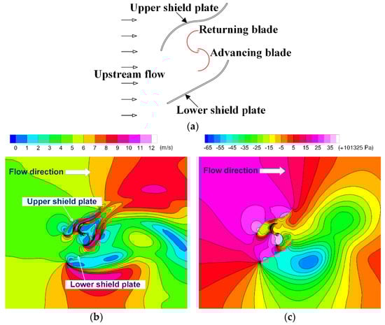 A shield plate was mounted upstream of the Savonius rotor as the rotor was used to absorb the kinetic energy of water []. With such a scheme, an increase in the power coefficient was proved. Essentially, the influence of adverse pressure gradients can be averted via the deployment of the shield plate, which serves as the most important reason of the improvement of rotor performance. A more flexible scheme of shield plates recorded in [] is schematically shown in Figure 5a. It is seen that two curved plates constituted a short duct within which the Savonius rotor was installed. In the present study, numerical simulation for such a scheme was performed and corresponding flow parameter distributions are shown in Figure 5b,c. It is noticeable that the duct bounded by the two plates is not parallel with the upstream flow. In the duct, the advancing blade is subjected to advantageous pressure difference, while the resistance to the returning blade is mitigated with the jet-like flow structure near the tip of the returning blade, as shown in Figure 5b. Moreover, for the returning blade, pressure at the concave side is higher than that at the convex side, as indicated in Figure 5c; this facilitates the counter-clockwise rotation of the rotor as well. Furthermore, it has been proved in [] that the combination of the Savonius rotor and shield plates promotes the rotor performance at all rotor rotation angles.