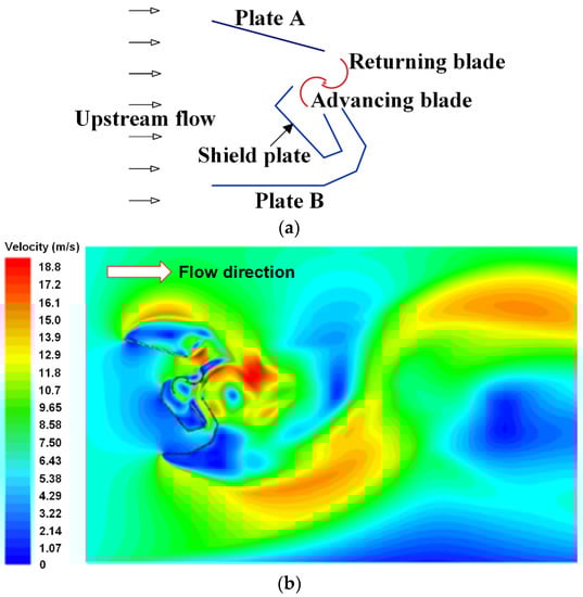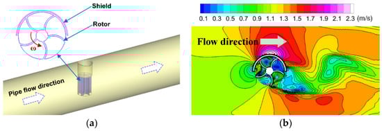 A scheme with a Savonius rotor installed in a pipe was reported in []. The uniqueness of such a scheme lies in that a semi-circular shield was used to shield half of the rotor, as shown in Figure 16a. In the present study, numerical simulation was carried out to describe flow patterns associated with such a scheme. The flow velocity distribution obtained numerically is displayed in Figure 16b. With such a baffle, the negative influence of the upstream flow on the anticlockwise rotation of the rotor is alleviated considerably. Meanwhile, a high-velocity zone is seen on the upper side of the baffle. This is due to the minimizing of the flow area between the pipe wall and the convex surface of the baffle. The rotor is equipped with five blades, enlarging the contact area between the rotor and fluid. The role played by the shield shown in Figure 16 is similar to that assumed by the curtains and the deflector, which are indicated in Figure 2 and Figure 4. Similar concept has been advised in [], where proof was presented to support the improvement of the rotor performance due to partially blocked upstream flow as the bulk flow was confined in a duct.