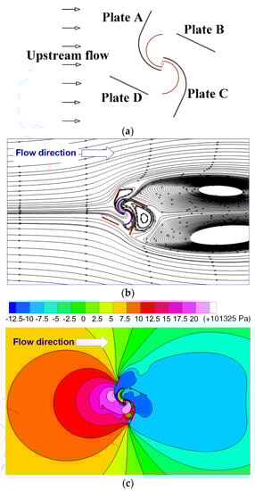 Scheme of asymmetrically arranged auxiliary plates. (a) Sketch of the multiple-plate scheme []; (b) Streamlines; (c) Pressure distribution.