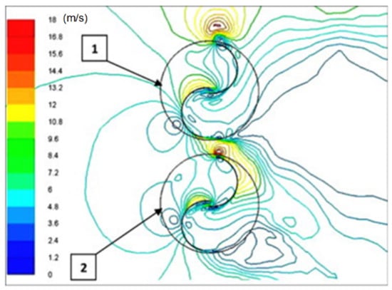 Fundamentally, more energy can be extracted from the nature with multiple Savonius rotors. Nevertheless, inappropriate rotor arrangement might results in low rotor performance and even rotor operation instability. In this case, the interaction among neighboring rotors is significant. A two-rotor scheme proposed in [] is shown in Figure 8. It is seen that the gap between two rotors is small, and both rotors suffer from the influence of the gap flow. With the synchronous rotation of the two rotors, the gap flow will take time-dependent form and affects the flow velocity distribution in the circular rotor rotation region periodically.