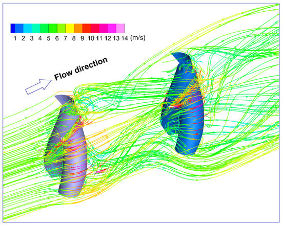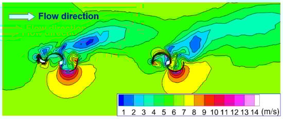 Provided that the Savonius rotors employed in the wind farm are equipped with three-dimensional curved blades, the upstream flow situation encountered by the downstream rotor will bear clear spatial non-uniformity along the direction parallel to the rotor axis. In the present study, three-dimension flows for such a configuration were simulated, the result is illustrated in Figure 12.