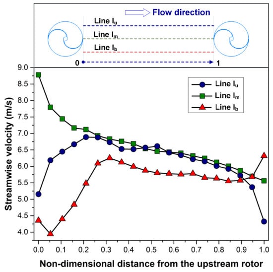 To investigate the effect of the inter-rotor distance on the upstream flow of the downstream rotor, the streamwise distance between two rotors shown in Figure 9 is enlarged to five times the rotor diameter. Numerical simulation was performed for this configuration as well. Velocity distributions over three horizontal lines evenly distributed between the two rotors are constructed and plotted in Figure 10. The non-dimensional abscissas of 0 and 1 represent the two rotation region edges, respectively, as marked in Figure 10. The imparity between the three velocity curves is remarkable near the upstream rotor, as is related to the strong effect of the wake flow. Then the three curves experience a fairly smooth stage, which signifies that the effect of the upstream rotor decays in streamwise direction. Near the downstream rotor, obvious deviation between the three curves arises again, and this is determined by the boundary effect and rotation of the downstream rotor. As for the optimum inter-rotor distance, it is related to the tip-speed ratio and rotor geometry. Frequently, turbulent fluctuations in this unique upstream flow should be considered, enabling an evaluation of the reliability of the rotor and the operation stability of the whole unit.