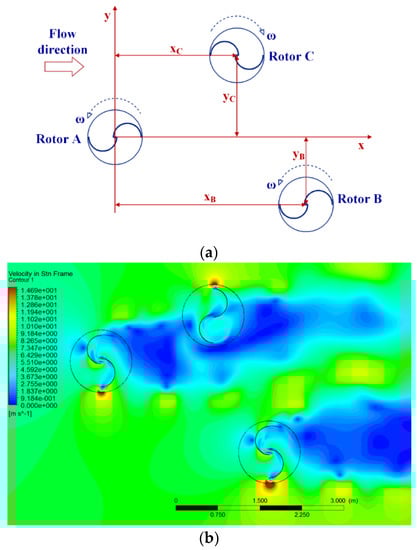 Scheme of three rotors and flow characteristic []. (a) Schematic view of the three-rotor configuration; (b) Velocity distribution near the three rotors.