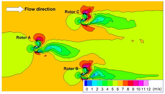 As three or more rotors operates in the same field, the rotor-rotor interaction deserves a consideration in both streamwise and transverse directions []. A representative is the triple-rotor scheme, as shown in Figure 11. The three rotors, namely Rotors A, B and C, are positioned with fairly uneven inter-rotor space. For the two downstream rotors, Rotors B and C, the upstream flows are different. Meanwhile, the interaction between the two downstream rotors is possible. In [], velocity distributions near the three rotors are presented, as displayed in Figure 11b. It is recognizable that Rotor B is exempted from the influence of the wake-type upstream flow, but the upstream flow of Rotor C is partially impressed by the wake flow of Rotor A. It should be pointed out that the rotation directions of Rotors A and C are opposite. Thus vortices in the wake flow of Rotor A are beneficial for the clockwise rotation of Rotor C, as can be envisaged based upon wake flow features of Rotor A, which rotates in anti-clockwise direction.