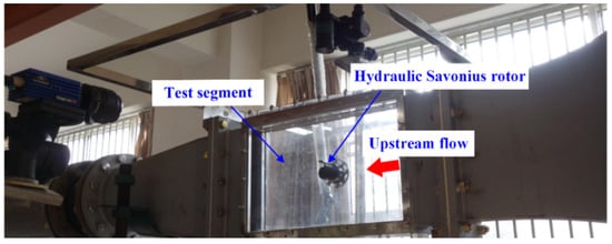 In the present study, a Savonius rotor was installed in the test segment of a water tunnel, as shown in Figure 14. The side walls of the test segment are made of plexiglass, enabling non-intrusive measurement or visualization of flows in the test section. Generally, two-dimensional Savonius rotor models are suitable for flow measurement. With the twisted Savonius rotor, the velocity component in transverse direction would disturb the data acquisition on the monitored plane.