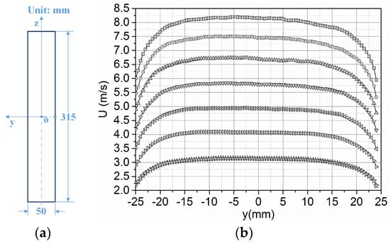 Cross-sectional upstream flow velocity distributions in the test section of a water tunnel: (a) cross-section dimensions of the test segment; (b) velocity distributions at different upstream velocity magnitudes.