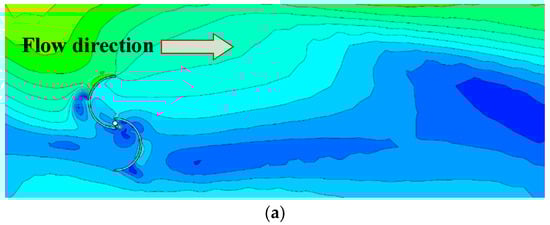 In view of the flow velocity distribution displayed in Figure 1, it is desirable that the resistance to the counter-clockwise rotation of the returning blade is minimized. This can be accomplished through installing a pair of curtains upstream of the Savonius rotor, which is shown in Figure 2a []. Curtains play the role of guiding the upstream flow towards improving the ratio of effective work. Upstream flow patterns obtained in the present study are shown in Figure 2 as well. It is seen that the two curtains guide the upstream flows to impinge the advancing blade, as indicated in Figure 2b. For the returning blade, the left and right sides are dominated by fairly equivalent pressure distributions, as shown in Figure 2c. Thus the resistance to the rotor delivered through the returning blade is undermined. Moreover, a comparison between Figure 1b and Figure 2b testifies that the wake flow characteristics change considerably with the participation of the curtains. Meanwhile, such an upstream flow control strategy improves the operation performance of the Savonius rotor [].