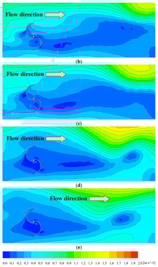 Time-dependent velocity distributions in wavy flows near a Savonius rotor. (a) T0; (b) T0 + 0.25 s; (c) T0 + 0.5 s; (d) T0 + 0.75 s; (e) T0 + 1.0 s.