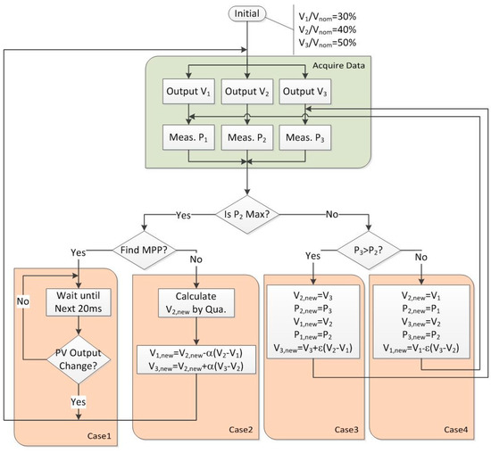 - Re-tracking: The QM method restarts the MPPT process when a significant change of output power occurs. If ΔV1 and ΔV2 become smaller during the previous MPPT process, they are not suitable for the next iteration and have to be reset in order to restart the MPPT process, which might deteriorate the efficiency of the MPPT method.