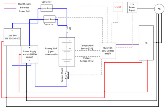 Charging and discharging of the battery pack can be carried out using the XBL-series load box from TDI Power and Lambda Zup power supply. The power supply can deliver a maximum of 40 A with a voltage limit of 20 V, whereas the loadbox has a maximum voltage and current of 50 V and 150 A, respectively. Both the power supply and load box communicate remotely using a serial interface, and the commands are executed using Python. For safety purposes, two contactors are included in the circuit, one for the charge loop and one for the discharge loop. A Nuvation Low Voltage Battery Controller™ is utilized for temperature, current, and cell voltage measurements along with cell balancing, and pack safety. The experimental data obtained from the test bench can be used for testing the different resistance estimation algorithms.