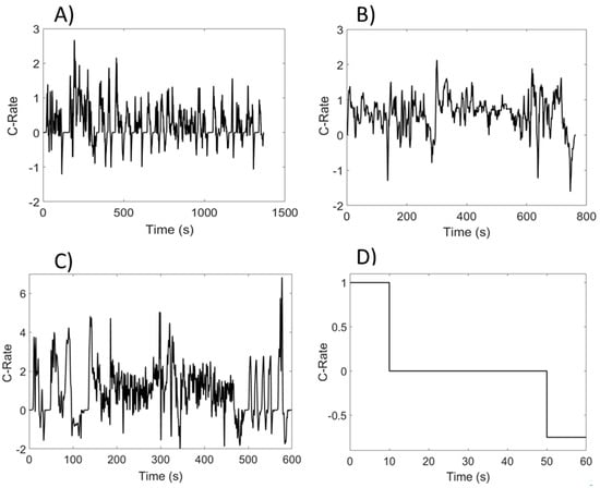 In addition to the drive cycles, a hybrid pulse power characterization (HPPC) test was carried out at the beginning of each test. The hybrid pulse power characterization (HPPC) test is frequently used in identifying the resistance of the battery [23]. The test consists of a 10 s discharge at 1 C, followed by a 40 s rest period and a 10 s charge at ¾ C. The test profile is shown in Figure 2D. The ohmic resistance obtained from the HPPC test provides a baseline upon which all other online estimation algorithms can be compared.