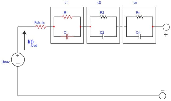 Equivalent circuit model used in describing the voltage response of Li-ion batteries.