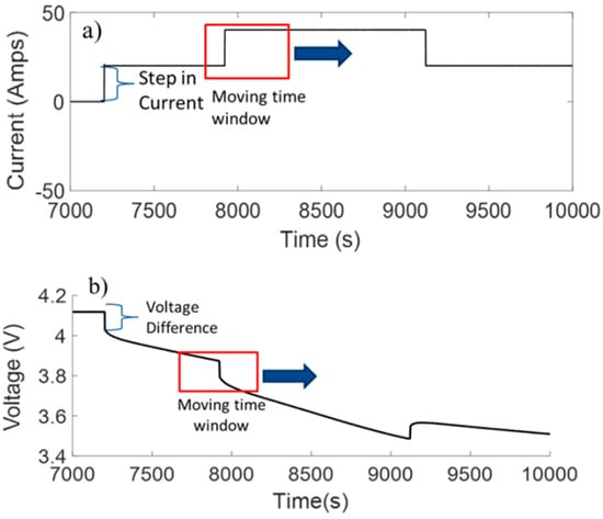 Direct resistance estimation (DRE) approach for estimating ohmic resistance in the battery, where (a) is the current profile and (b) is the corresponding voltage profile.