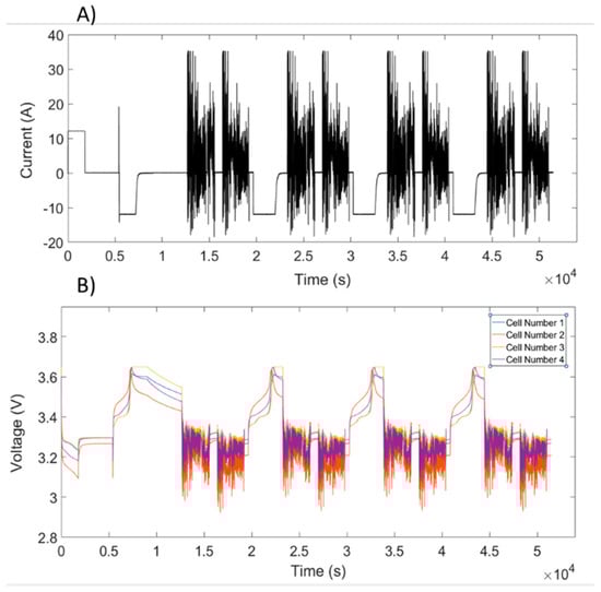 The validation current profile (A) and the corresponding voltage response (B) for the LFP battery pack at a constant temperature of 20 °C.