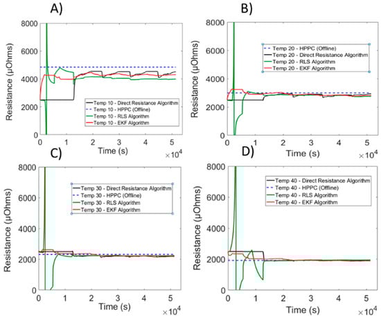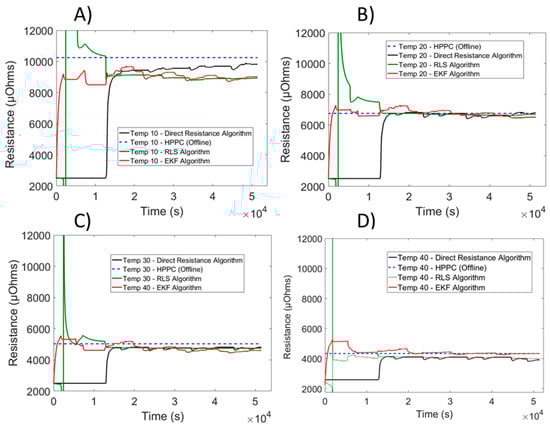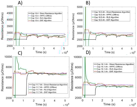 The three algorithms, discussed in Section 3, were developed in MATLAB (R2016b, MathWorks, Natick, Massachusetts, United States) and executed using the voltage and current data obtained from the test bench. The nominal resistance of each cell was set to 2500 µOhms to determine whether the algorithm could intelligently converge to the actual resistance of the individual battery. The results are shown in the Figure 6 below.