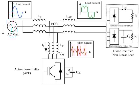 The basic compensation principle of shunt APFs is eliminating the current harmonics generated by critical loads. Generally, APFs are installed in a shunt position near the nonlinear load to compensate for the effect of harmonic nonlinearity [33]. APFs eliminate harmonics by injecting reactive or compensating current at the point of common coupling (PCC) into the power network. Each APF generates inverse harmonics as a mirror image to the nonlinear load harmonics, thereby canceling the harmonics and leaving the fundamental component to make the source current purely sinusoidal, as depicted in Figure 2 [28].