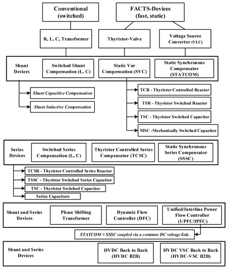 FACTS devices are increasingly required in modern transmission systems for high-power transfers [34]. Two types of FACTS devices, namely, SVCs and STATCOMs [35], can restore active power current and dynamic reactive power compensation [36]. These devices consist of the modular unit of the voltage source converter (VSC) equipped with insulated-gate bipolar transistors (IGBTs) for rapid switching and controlling using the PWM scheme. A STATCOM is a shunt device that is connected with PCC to provide voltage support and active and reactive power, increase transient stability and improve damping. A brief detailed classification of the FACTS devices is shown in Figure 3 [37,38].
